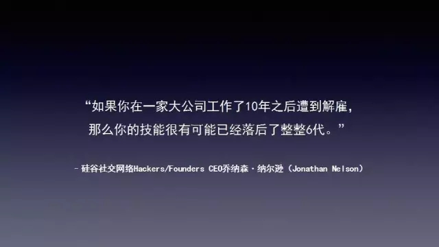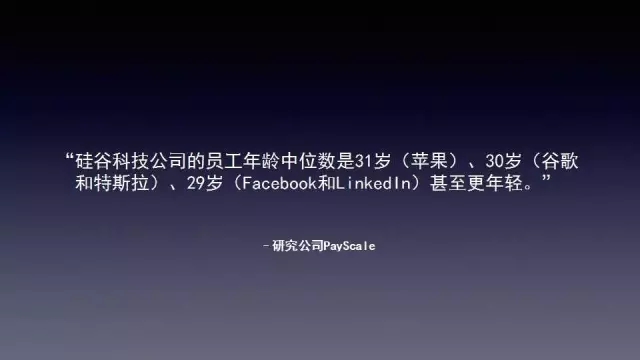 硅谷调研公司有数据显示,硅谷员工在苹果平均年龄是31岁,特斯拉是30岁,Facebook是29岁。还有一些年龄大的程序员被裁员后去做了Uber司机。Hackers/Founders CEO乔纳森·纳尔逊说过,“如果你在一家公司工作十年被兼顾可能你的技术落后了6代。”