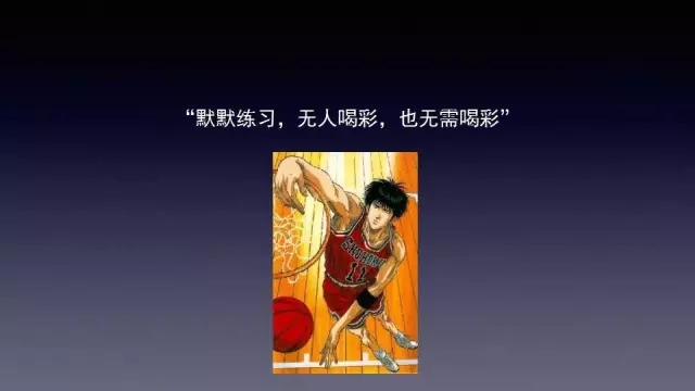 通过这样一个故事我想说什么?有一句话是,“做默默的练习,无人喝彩,也无需喝彩”,这是来自灌篮高手里的一句话。 在职场生涯中这是非常支撑我的一句话,因为你在做着跟身边同学不一样的事情,他们也许会不理解你,但你必须在这条属于你的职业道路上继续奔跑。